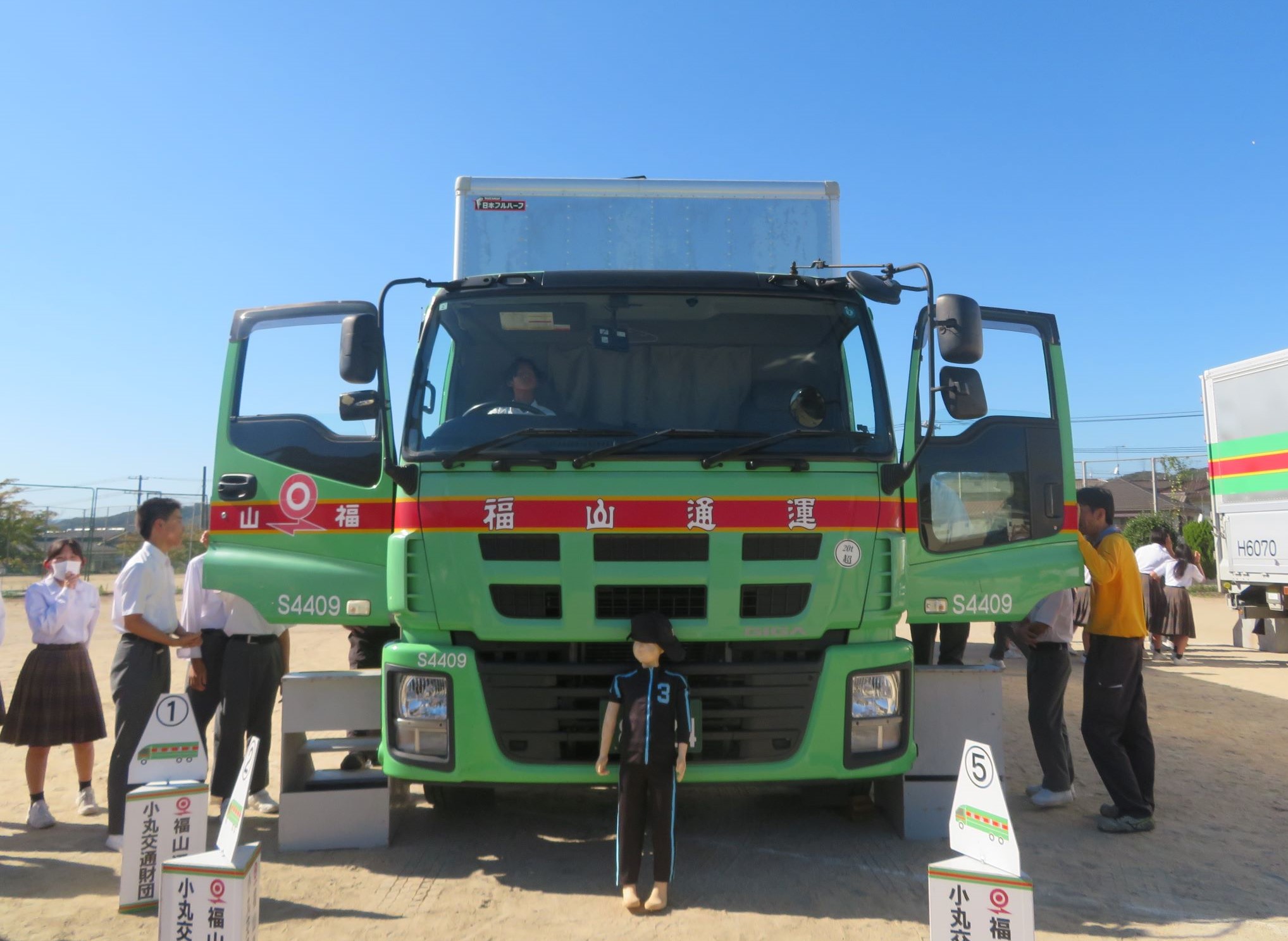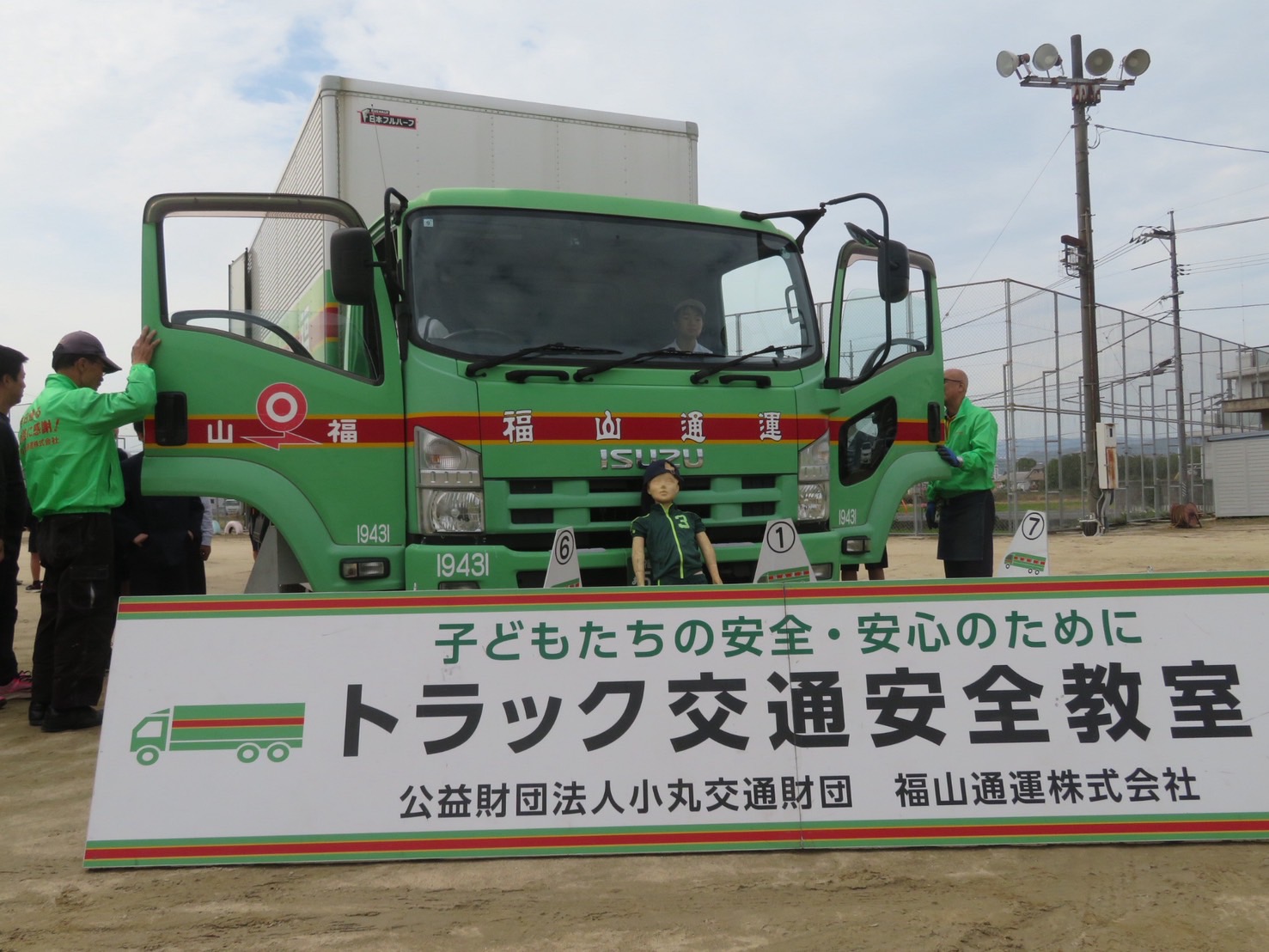 令和元年9月28日、福山メモリアルパークにおいて開催された「交通安全ファミリーランド2019」に参加しました。来場した子どもにトラックの死角体験を実施し、交通安全意識の高揚や交通事故防止を呼びかけました。