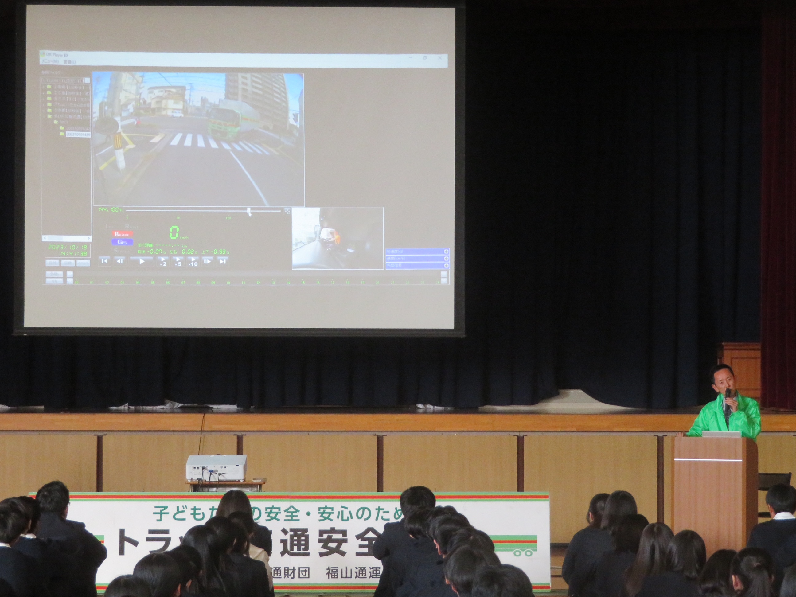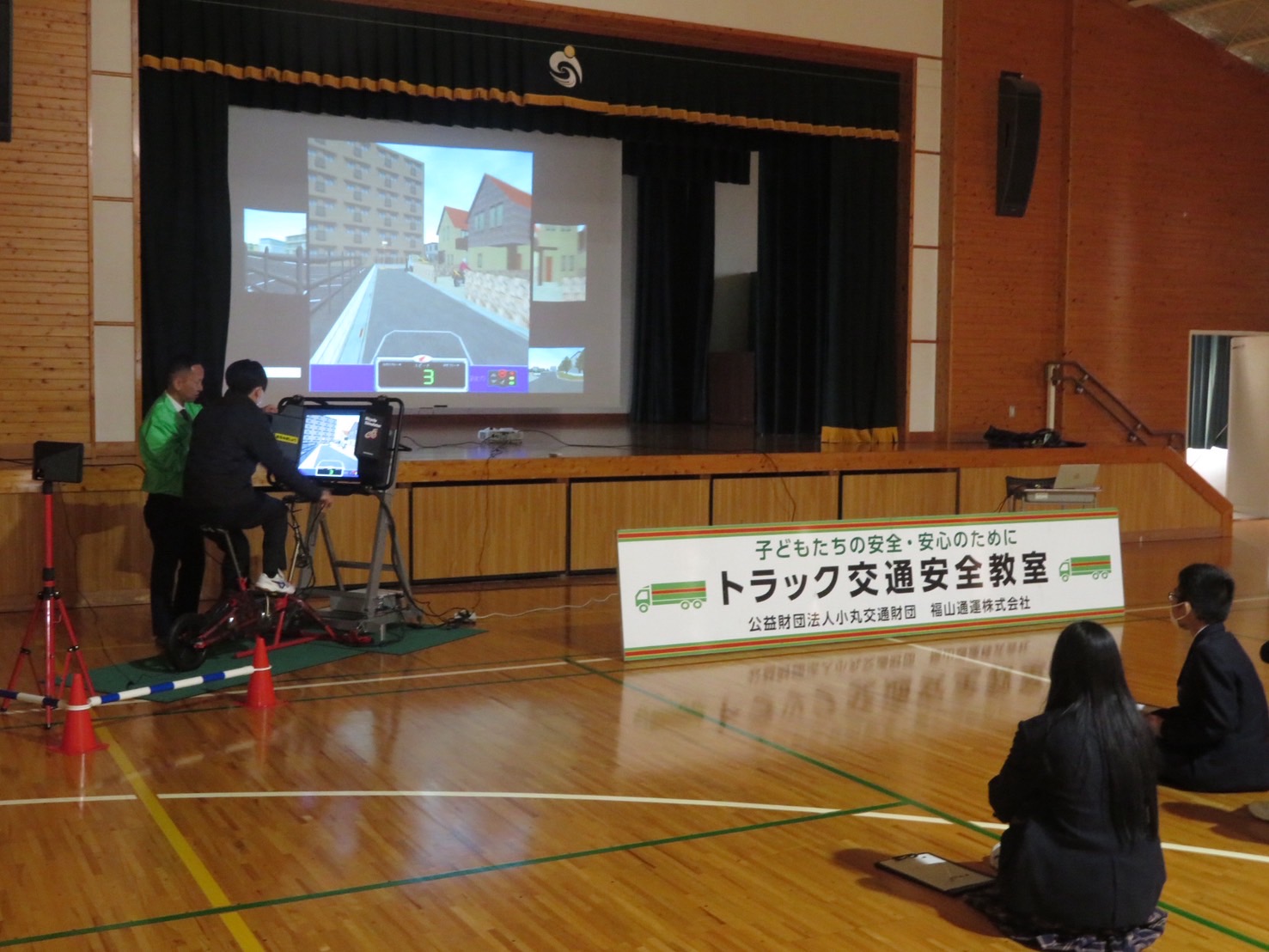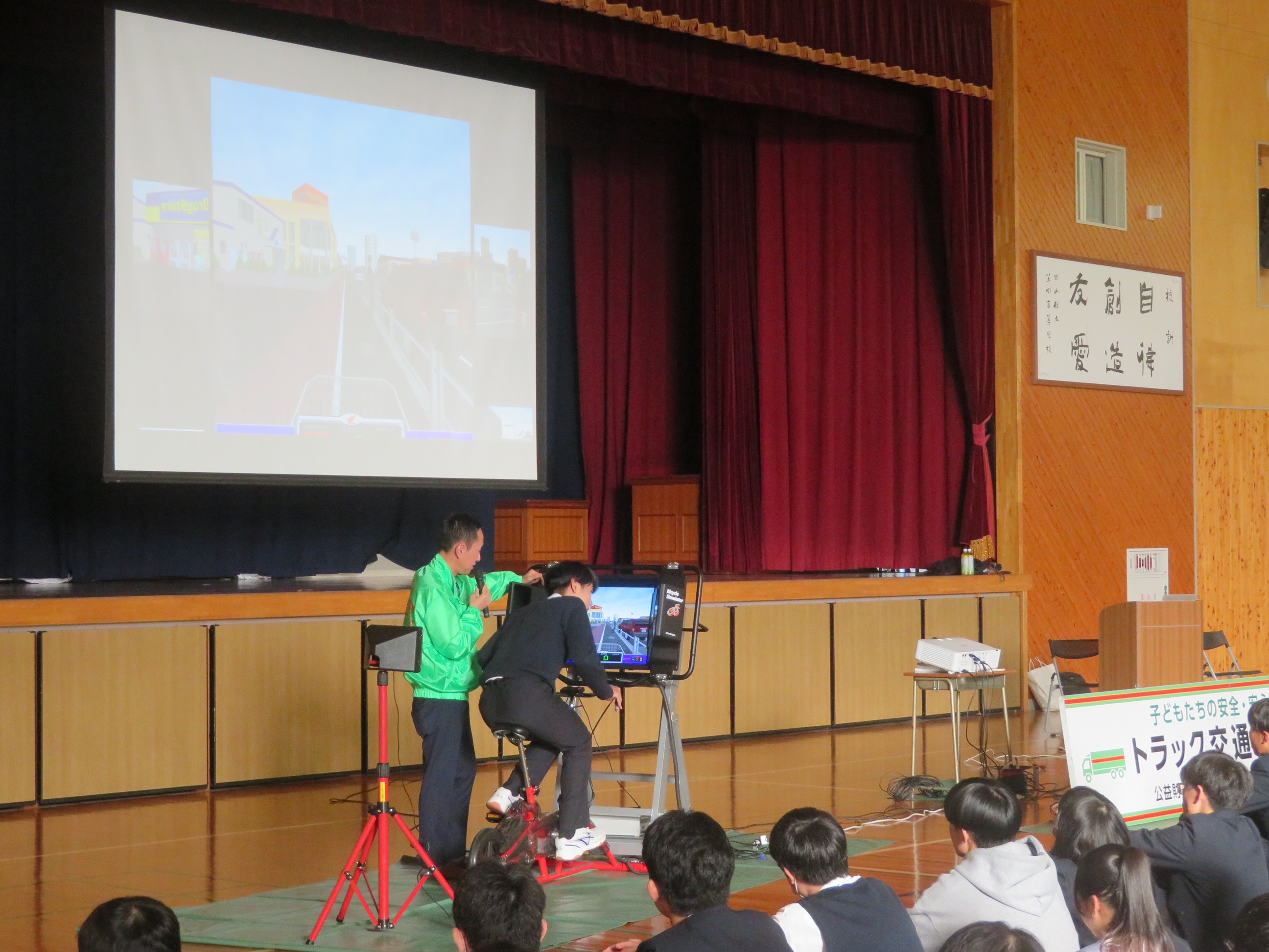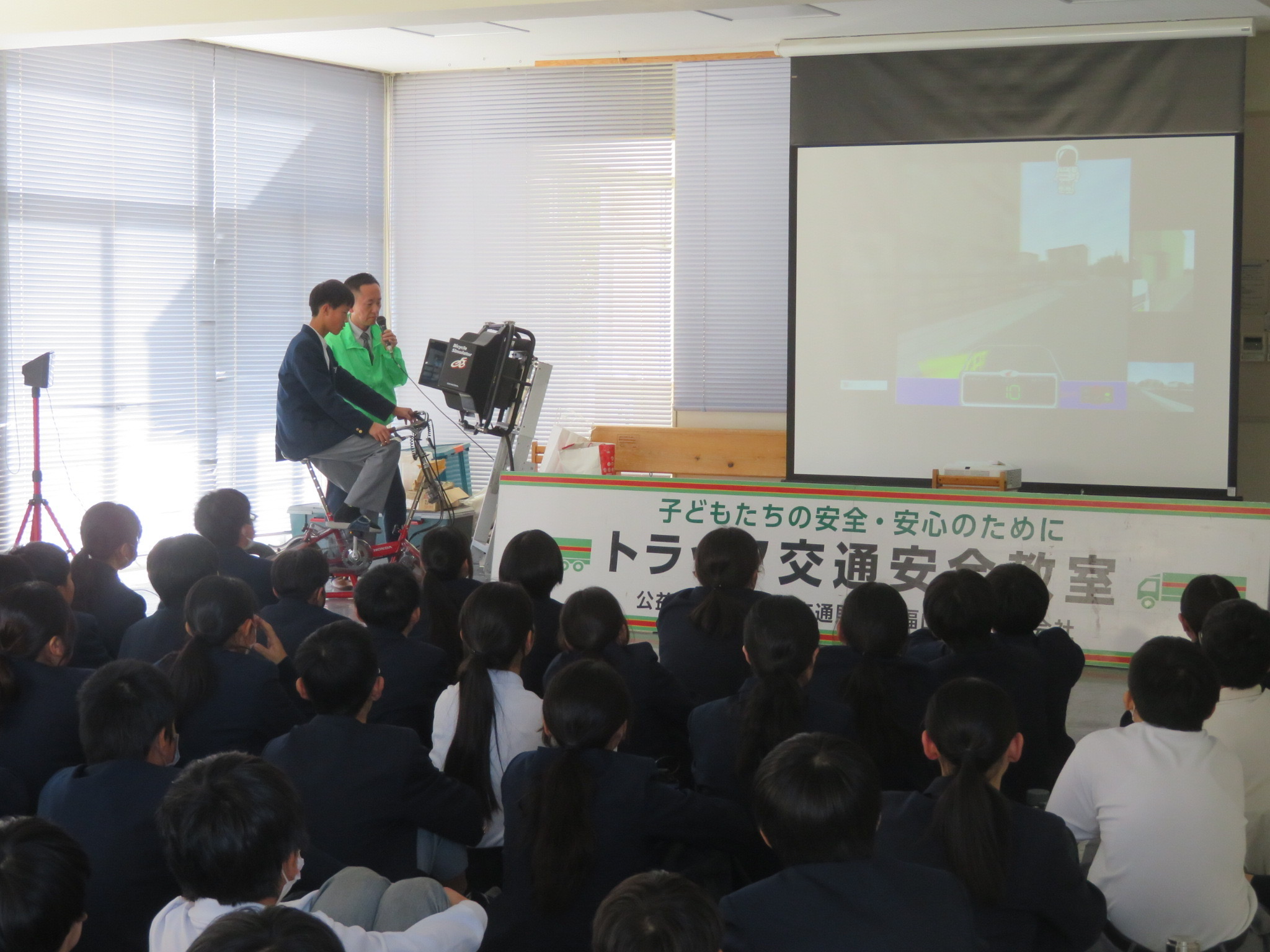 福山市立鳳中学校(広島県)において、1年生94名を対象に交通安全教室を開催しました。鳳中学校は住宅街にあり、自転車通学者が多いことから、自転車の運転における交通安全意識の向上を図りたい学校からの要請を受けて、ドライブレコーダーの映像や自転車シミュレータを使用した危険予測についての体験学習を行いました。生徒の皆さんからは「見通しの悪い交差点では、必ず一時停止し安全を確認して通行します」など、交通事故防止につながる感想がありました。