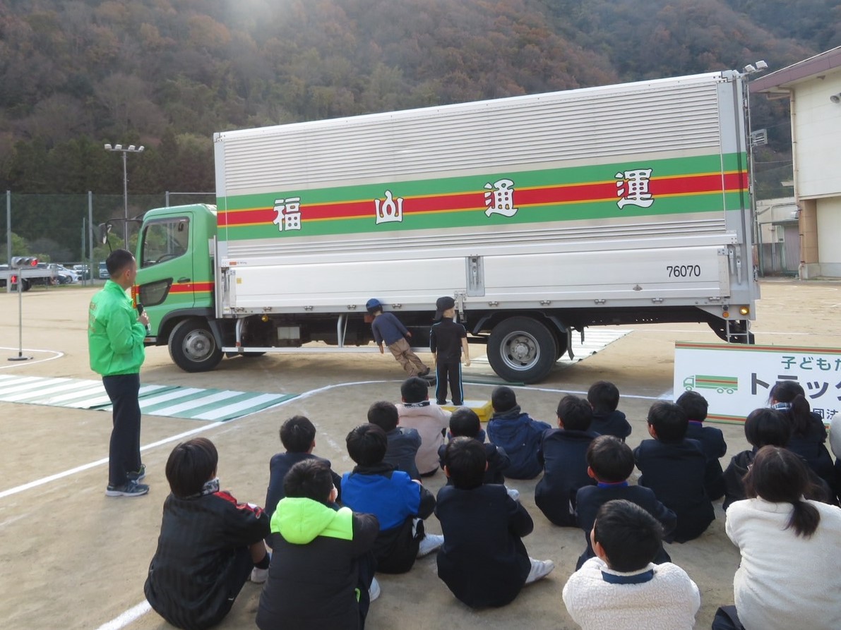 府中市立府中明郷学園(広島県)において、5年生30名を対象に交通安全教室を開催しました。府中明郷学園は、車の交通量が多い幹線道路に面しているため、登下校中の交通事故防止や交通安全意識の向上を図りたい学校の要望を受け、トラックの特性や危険性の実体験や、交差点や横断歩道における安全行動等について体験学習を行いました。児童の皆さんからは「交差点では、トラックの内輪差や死角に気をつけたい」など、交通安全意識を強くした感想がありました。